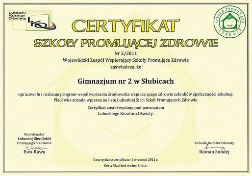 Uroczystość podsumowująca projekt odbyła się 16 listopada w Zielonej Górze, podczas XVII Forum Szkół Promujących Zdrowie. W imieniu kuratora certyfikaty wręczała Pani Ewa Rawa - Koordynator Lubuskiej Sieci Szkół Promujących Zdrowie. Certyfikat zaświadcza, że szkoła opracowała i realizuje program współtworzenia środowiska wspierającego zdrowie członków społeczności szkolnej.