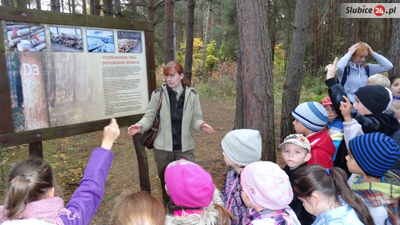 Na Bobrowym Szlaku dzieci poznały najważniejsze informacje dotyczące lasu – rosnącego drzewostanu, sposobu opieki na chorymi drzewami oraz kontrolowanej wycinki. Przedstawicielka nadleśnictwa opowiadała również o tym, jak należy zachowywać się w lesie. Dzieci obejrzały paśnik dla zwierząt oraz miejsce, gdzie swoje jaja składają żółwie.