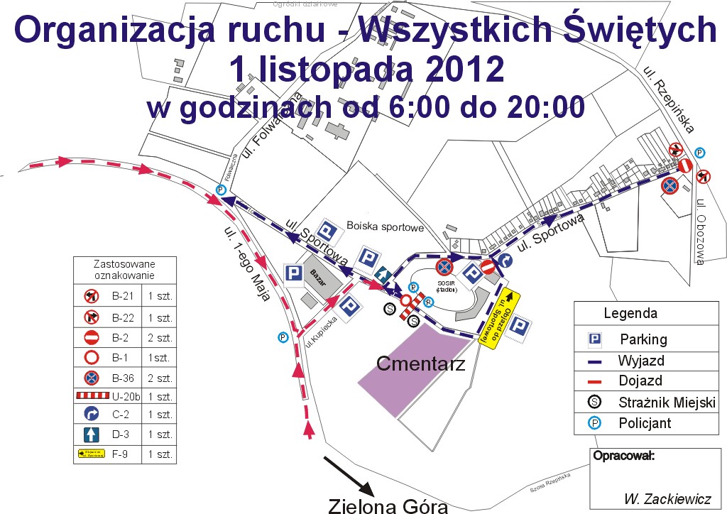 Przy skrzyżowaniu ul. Sportowej z drogą brukową, prowadzącą w górę bezpośrednio do cmentarza, zostanie ustawiony wspólny posterunek policji i straży miejskiej, który będzie regulował ruch pojazdów wjeżdżających na parking przy cmentarzu. Bezpośrednio do cmentarza dojechać będą mogły tylko osoby niepełnosprawne i starsze. Wyjazd z tego parkingu odbywać się będzie w kierunku ul. Sportowej specjalnie utwardzonym i oznakowanym zjazdem za Ośrodkiem Sportu i Rekreacji.