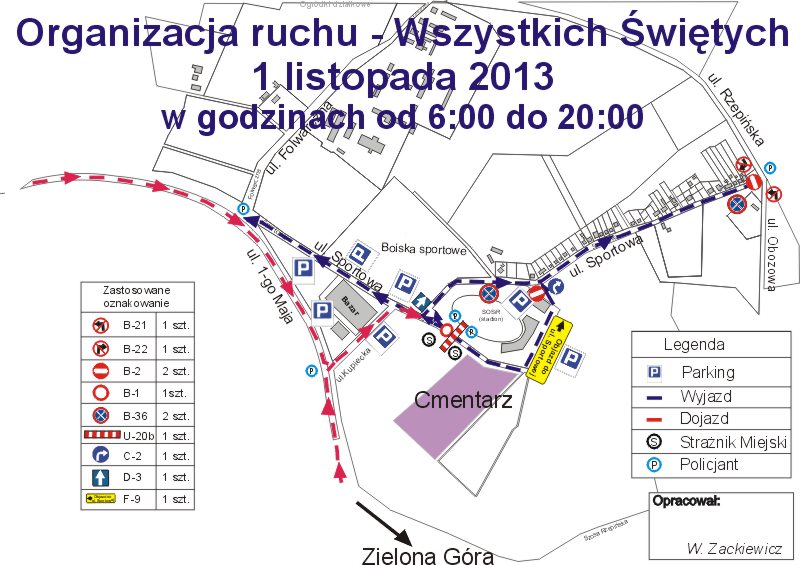 Dojazd do parkingów położonych wokół cmentarza i bazaru odbywać się będzie ul. 1-go Maja i ul. Kupiecką, a wyjazd ul. Sportową, dalej Rzepińską, Obozową i Folwarczną. Fragment ul. Sportowej na odcinku od drogi brukowej na cmentarz do skrzyżowania z ul. Obozową i Rzepińską będzie ulicą jednokierunkową.