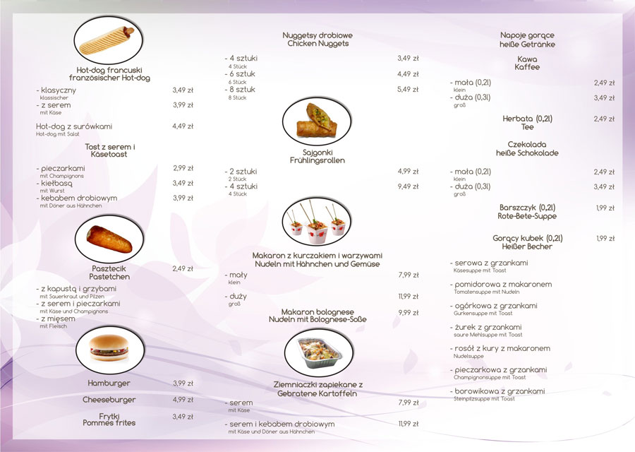 - Pyszne hot-dogi z surówkami (4,49 zł) bądź francuskie (od 3,49 zł). Jako jedyni oferujemy hot-dogi francuskie z serem (3,99 zł)!