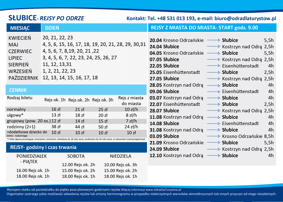 Pierwsza wizyta Zefira w Słubicach potrwa do piątku. Do czwartku będzie można popływać po Odrze codziennie o 16. i 18. Z kolei w piątek o godz. 9.00 czeka nas rejs przepływowy ze Słubic do Kostrzyna. Dla grup szkolnych istnieje możliwość rezerwacji rejsów w godzinach przedpołudniowych (do godz. 15.00). Rezerwacje telefoniczne pod nr. tel. 531 013 193.