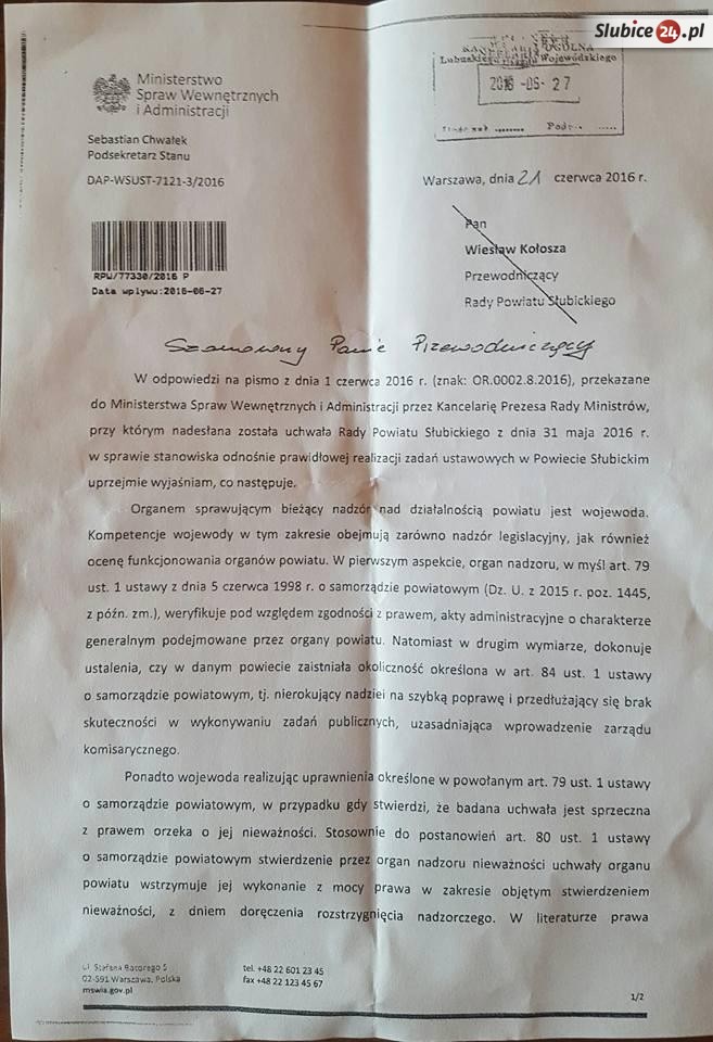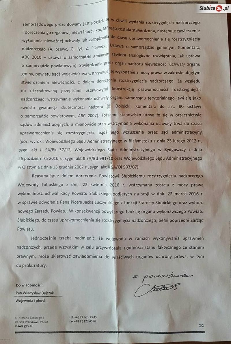 Wszystko zaczęła się wczoraj popołudniu, gdy do gabinetu starosty wrócił Piotr Łuczyński uzasadniając to decyzją otrzymaną na piśmie z Ministerstwa Spraw Wewnętrznych i Administracji (skan poniżej).