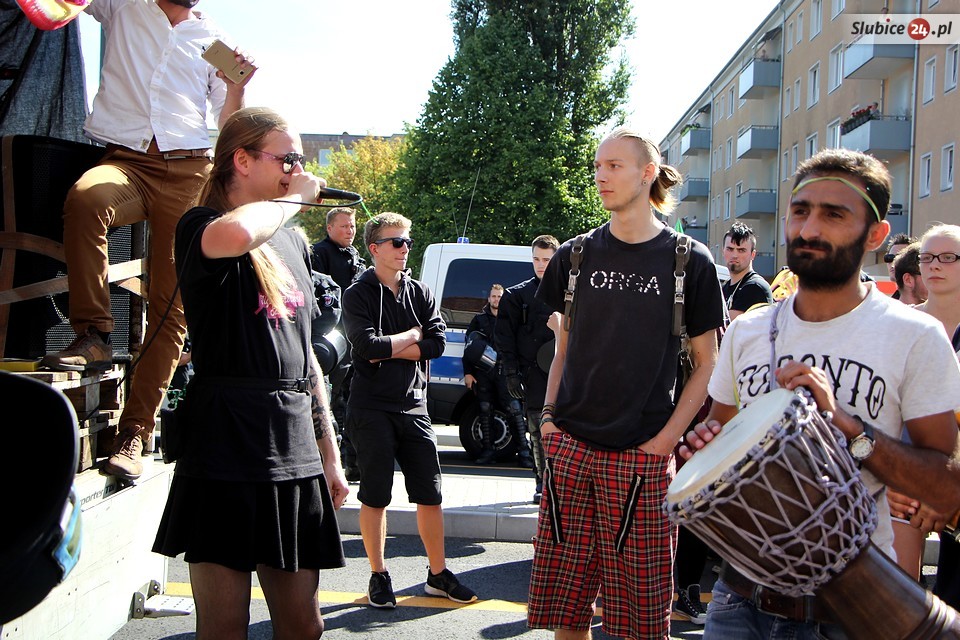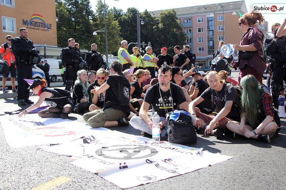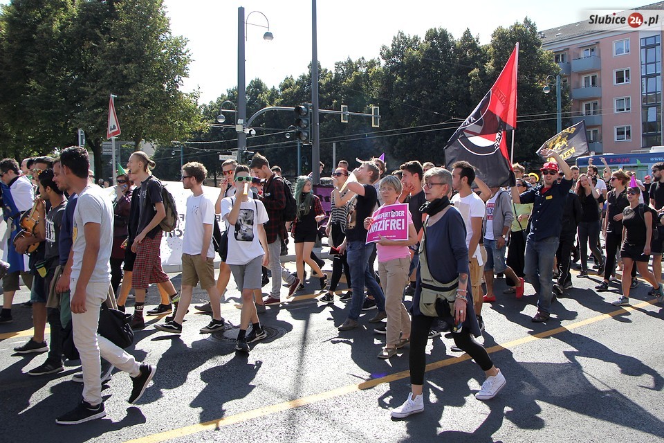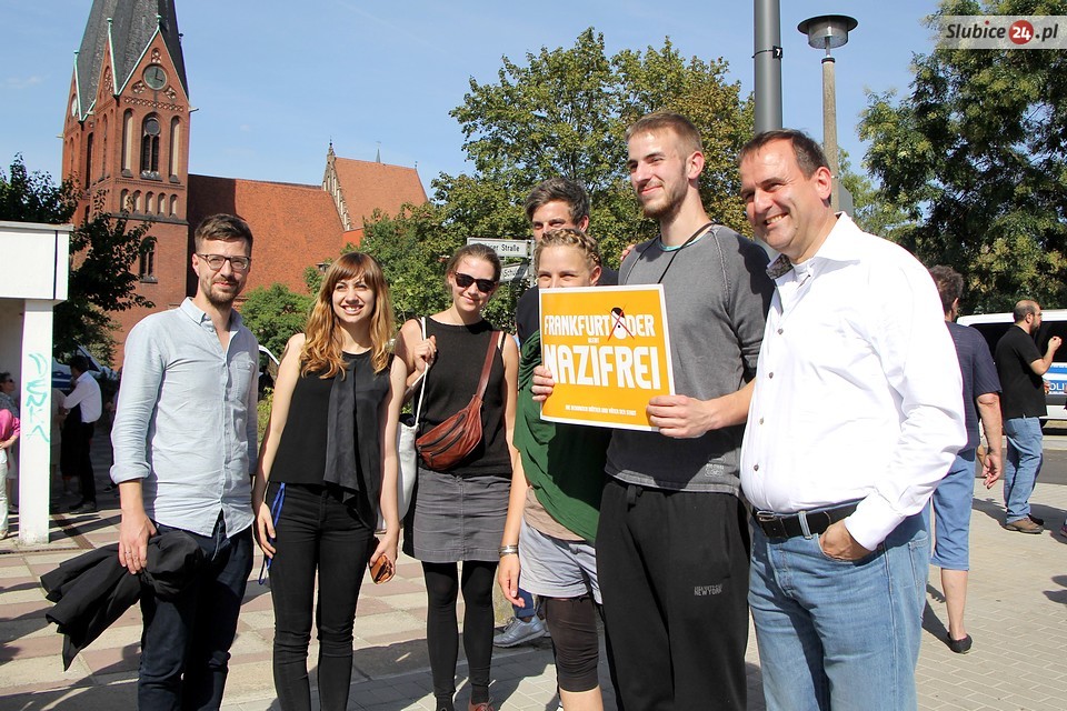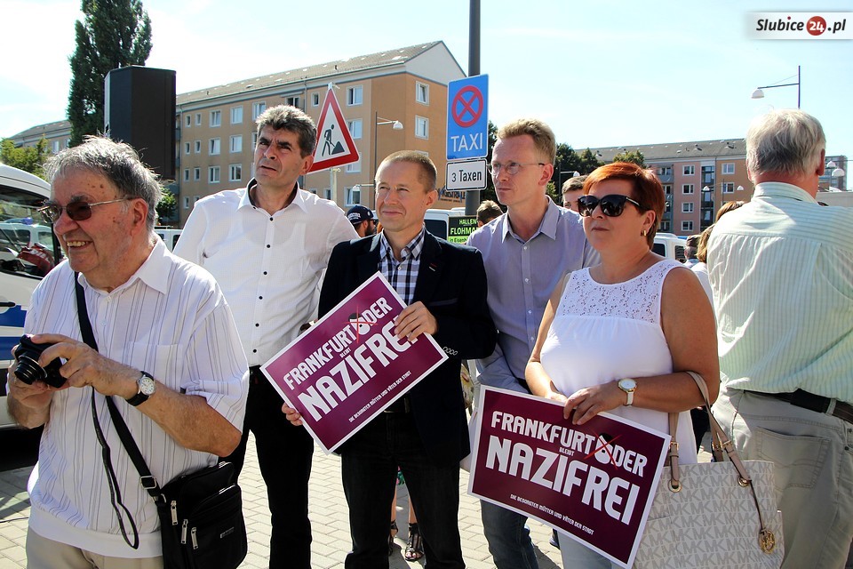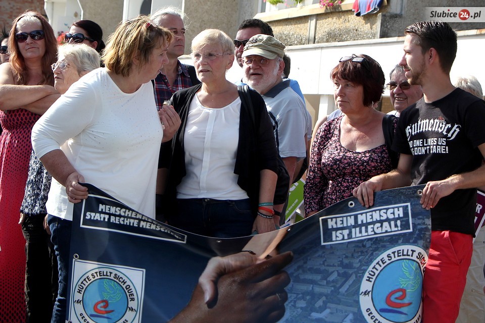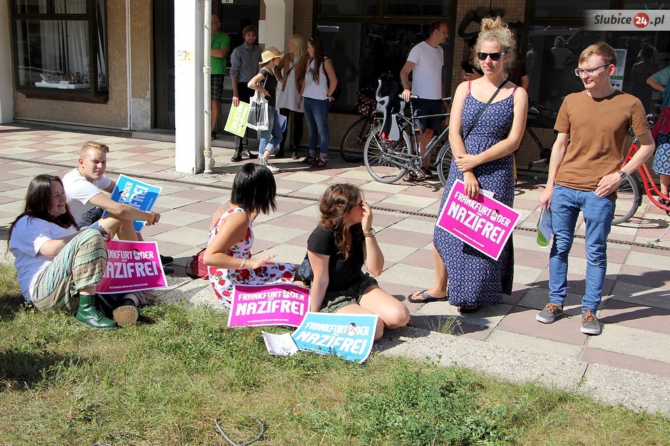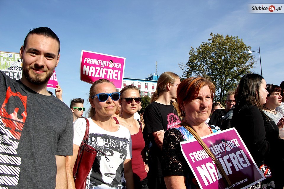 Pierwsze zgromadzenie, organizowane pod auspicjami władz Słubic i Frankfurtu, rozpoczęło się o godz. 14. Protestujący, którym przyświecało hasło "Frankfurt Oder bleibt nazifrei" (Frankfurt wolny od nazizmu), zgromadzili się w rejonie ul. Słubickiej, w miejscu byłego przejścia granicznego. Nadburmistrz Martin Wilke oraz wiceburmistrz Roman Siemiński wystosowali apel do mieszkańców o solidarność z imigrantami i sprzeciw wobec rasizmu i wrogości w stosunku do obcych. Zadeklarowali gotowość do udzielenia wsparcia dla migrantów. Na wiecu pojawiło się także wielu uchodźców, którzy grali i śpiewali.