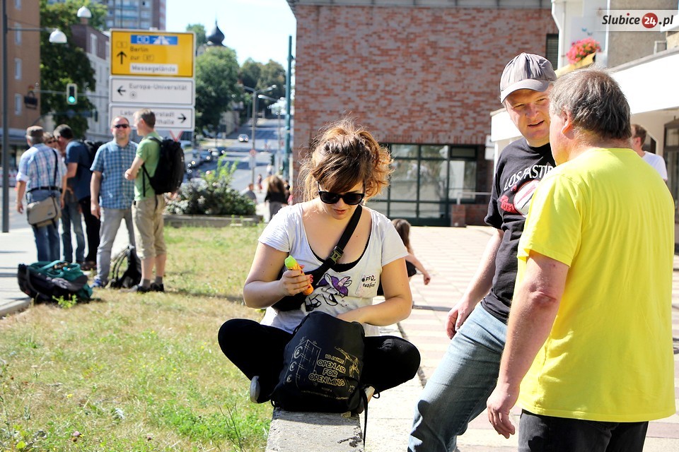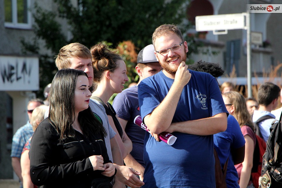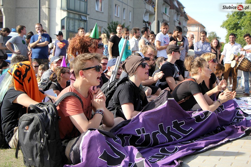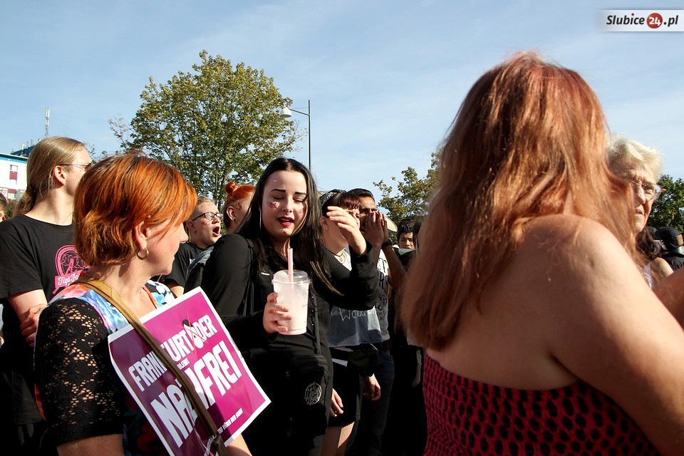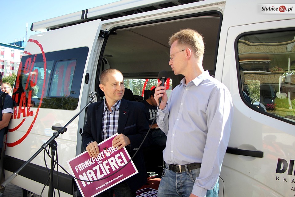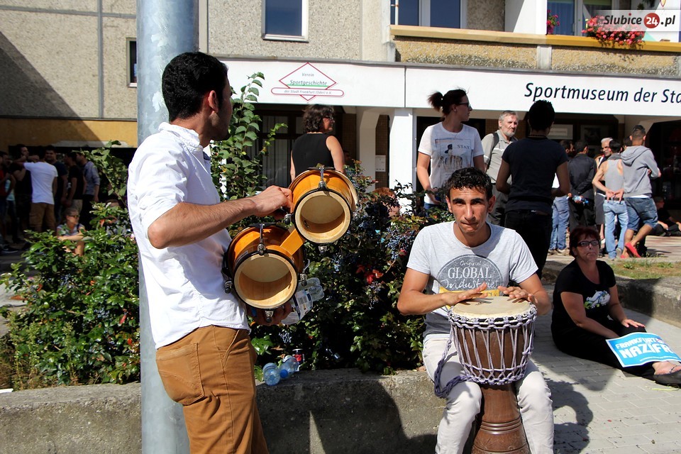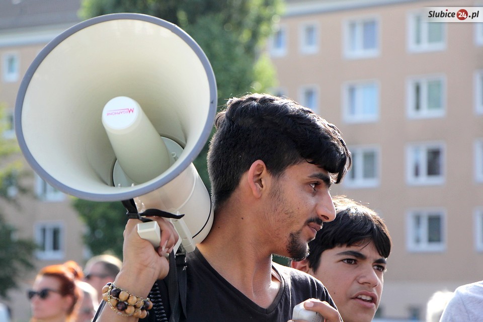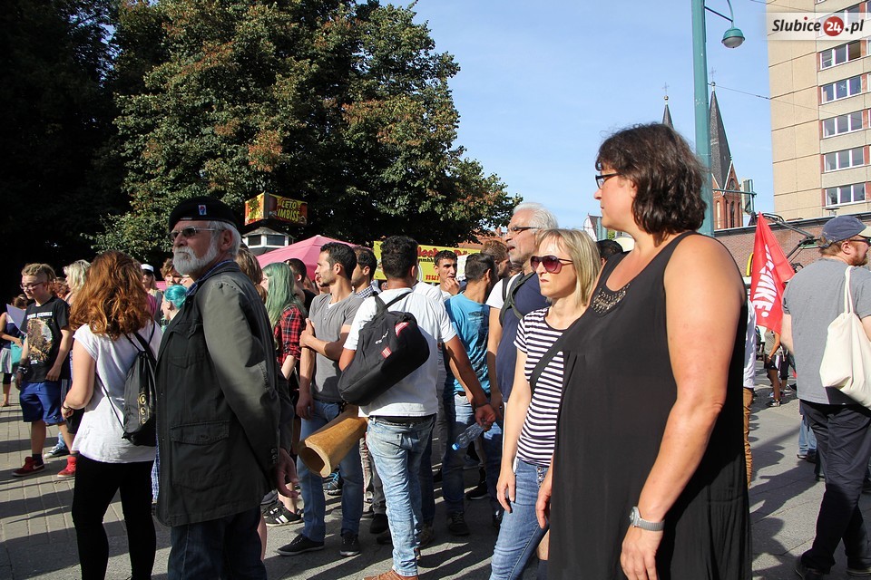 Pierwsze zgromadzenie, organizowane pod auspicjami władz Słubic i Frankfurtu, rozpoczęło się o godz. 14. Protestujący, którym przyświecało hasło "Frankfurt Oder bleibt nazifrei" (Frankfurt wolny od nazizmu), zgromadzili się w rejonie ul. Słubickiej, w miejscu byłego przejścia granicznego. Nadburmistrz Martin Wilke oraz wiceburmistrz Roman Siemiński wystosowali apel do mieszkańców o solidarność z imigrantami i sprzeciw wobec rasizmu i wrogości w stosunku do obcych. Zadeklarowali gotowość do udzielenia wsparcia dla migrantów. Na wiecu pojawiło się także wielu uchodźców, którzy grali i śpiewali.