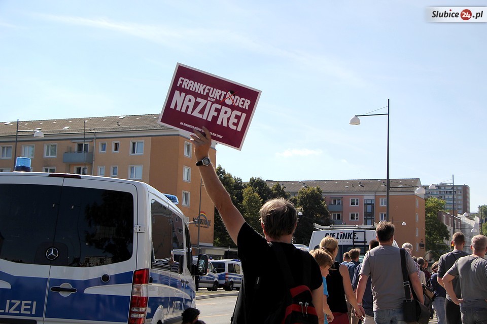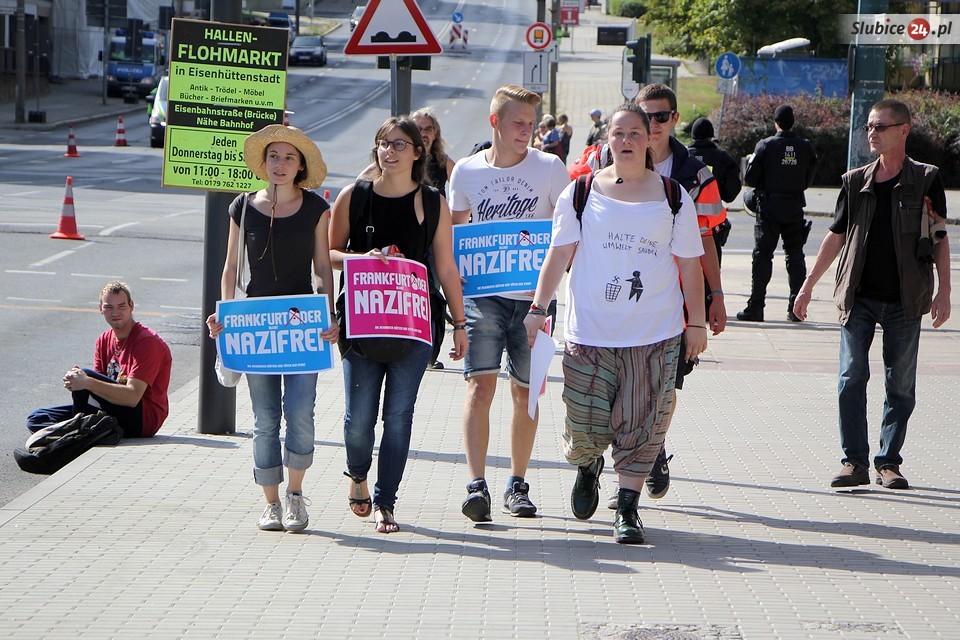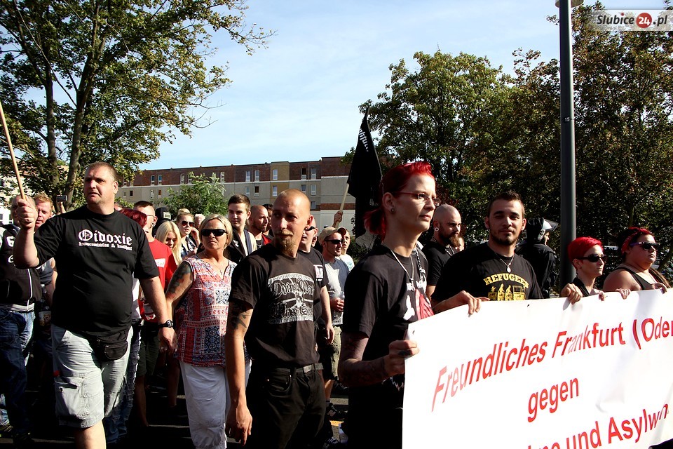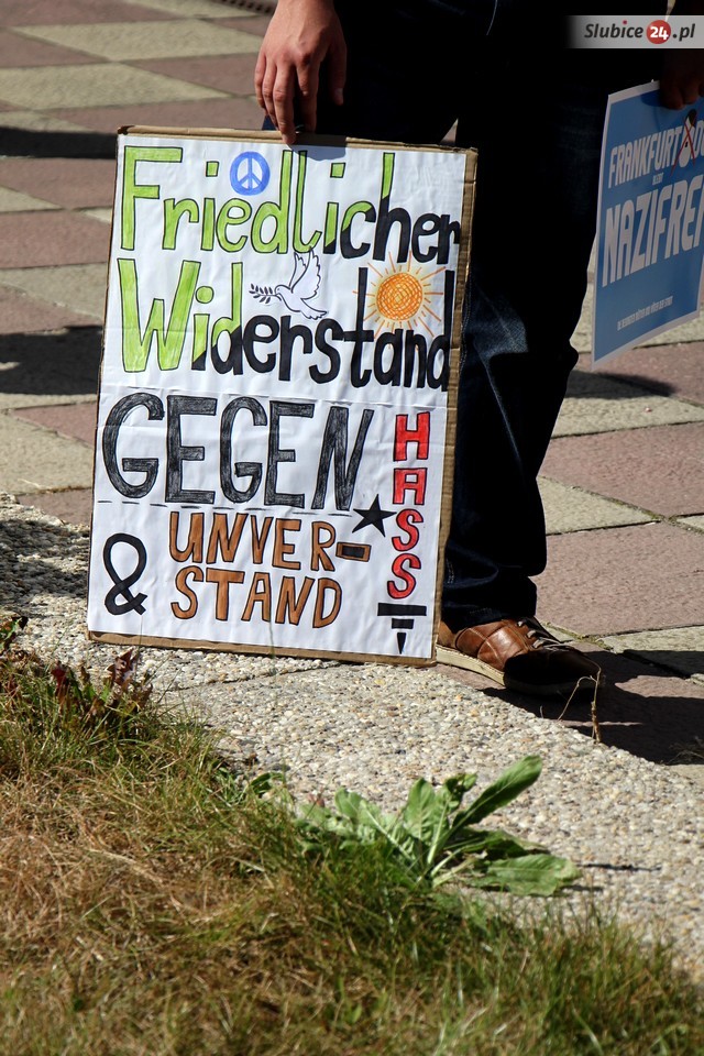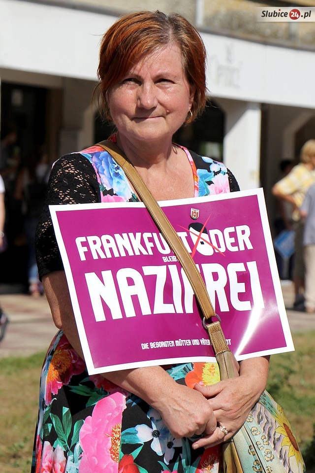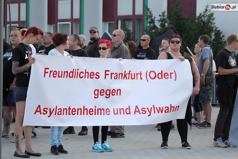 Godzinę później w tym samym miejscu rozpoczęła się demonstracja przeciwników imigrantów pod hasłem zatrzymania napływu azylantów (Asylflut stoppen). Za koordynację protestu odpowiadała organizacja "Frankfurt (Oder) wehrt sich" (Frankfurt broni się). Protestujący wyrażali swoje zaniepokojenie obecną sytuacją w Niemczech związaną z obecnością imigrantów. Krzyczeli, że nie chcą tworzenia kolejnych ośrodków imigranckich i przyjmowania obcych, którzy nie potrafią integrować się z niemieckim społeczeństwem.