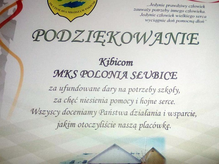 - Dziękujemy kibicom Polonii Słubice za ufundowane dary na potrzeby szkoły, za chęć niesienia pomoci i hojne serce. Wszyscy doceniamy Państwa działanie i wsparcie jakim otoczyliście naszą placówkę - napisali na dyplomie przedstawiciele szkoły.