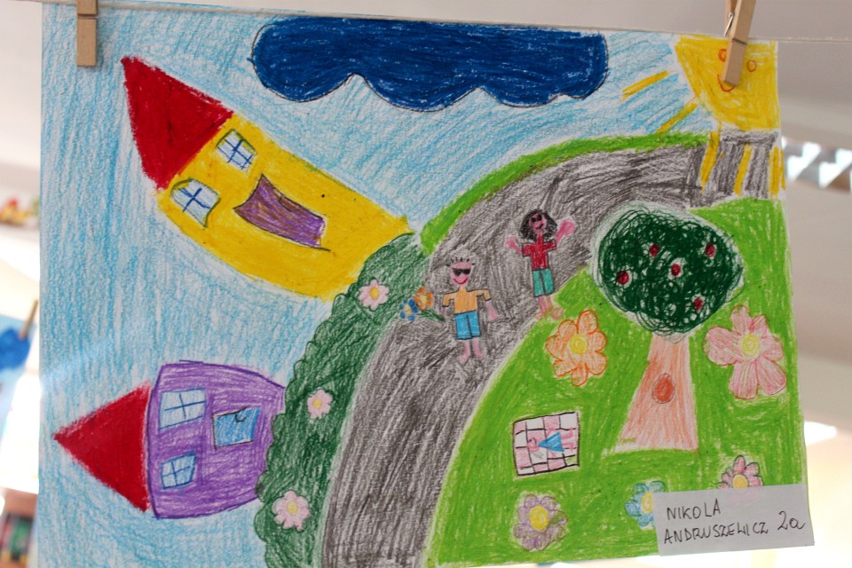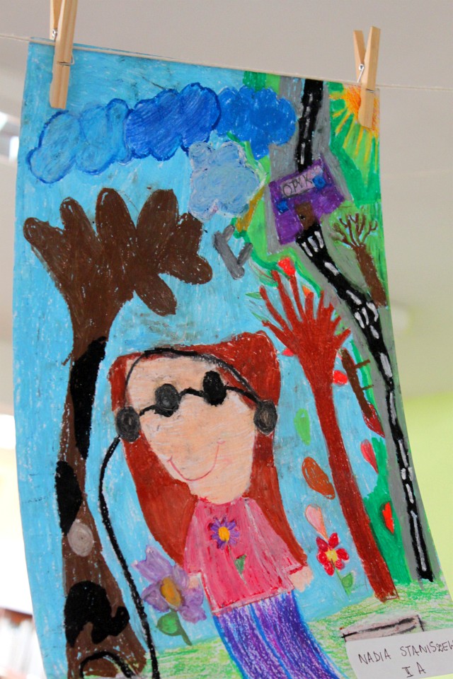 Dzieci narysowały również osoby niewidome: pana młodego, który bierze ślub, mężczyznę idącego po ulicy z białą laską. Pomysłów i kreatywności im nie brakowało. Każdy z nich na swój sposób przedstawił, dlaczego warto dbać o wzrok.