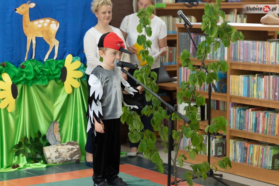 Przedszkolaki przygotowywały się do występów ucząc się recytować „leśne” wiersze np. o: jeżach, drzewach, dzięciołach, sowach, mrówkach…I 20 maja pojawiły się w słubickiej bibliotece, bardzo przejęte czekającym je występem.