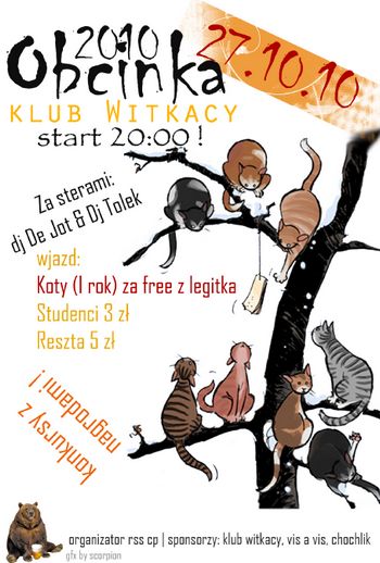 Klub Witkacy zaprasza na imprezę zatytułowaną "Obcinka 2010". Głównymi bohaterami środowej zabawy będą studenci pierwszego roku. O oprawę muzyczną zadbają DJ De Jot oraz DJ Tolek. Dla przybyłych gości organizatorzy zaplanowali konkursy z nagrodami.