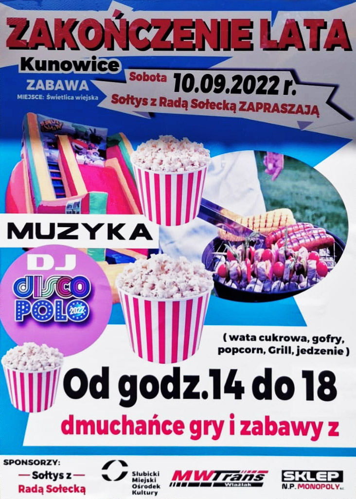 Sołtys i rada sołecka Kunowic zapraszają na festyn z okazji zakończenia lata. Będzie muzyka, dmuchańce, gry i zabawy, jedzenie, grill i słodkie przekąski.