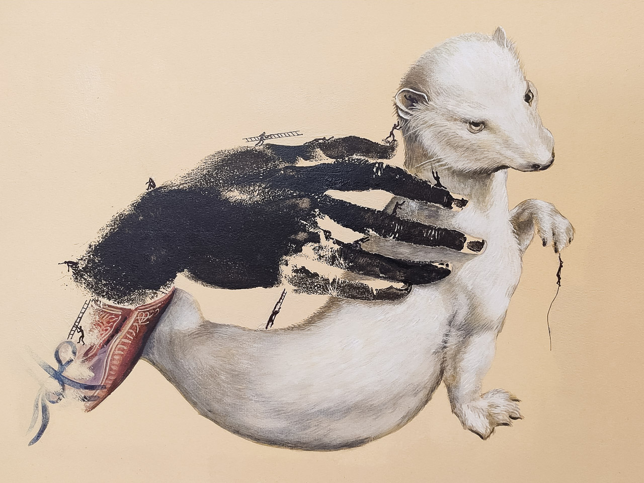 Jak czytamy w opisie wystawy, autor w swoich pracach zestawia charakterystyczne gesty swoich dłoni z uwikłanymi w rozmaite relacje postaciami. Tworzą one swoistą narrację, budują i rozładowują napięcie. Uwiązane i zależne od siebie emocjonalnie i fizycznie, walczące i wspomagające się nawzajem.