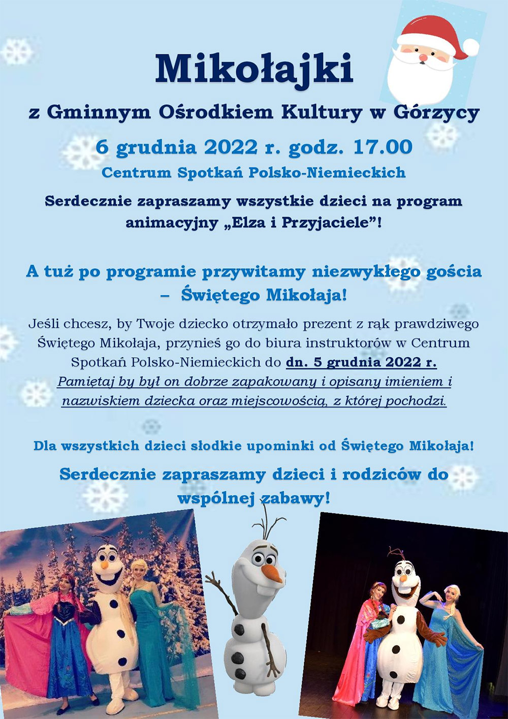 6 grudnia o godz. 17:00 Gminny Ośrodek Kultury w Górzycy organizuje Mikołajki. Na dzieci czeka wiele atrakcji, w tym program animacyjny. Gościem specjalnym będzie oczywiście św. Mikołaj.