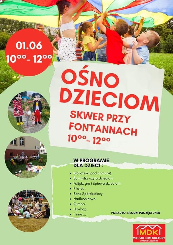Ośno Lubuskie zaprasza na imprezę z okazji Dnia Dziecka. Zabawa odbędzie się 1 czerwca na skwerze przy fontannach.