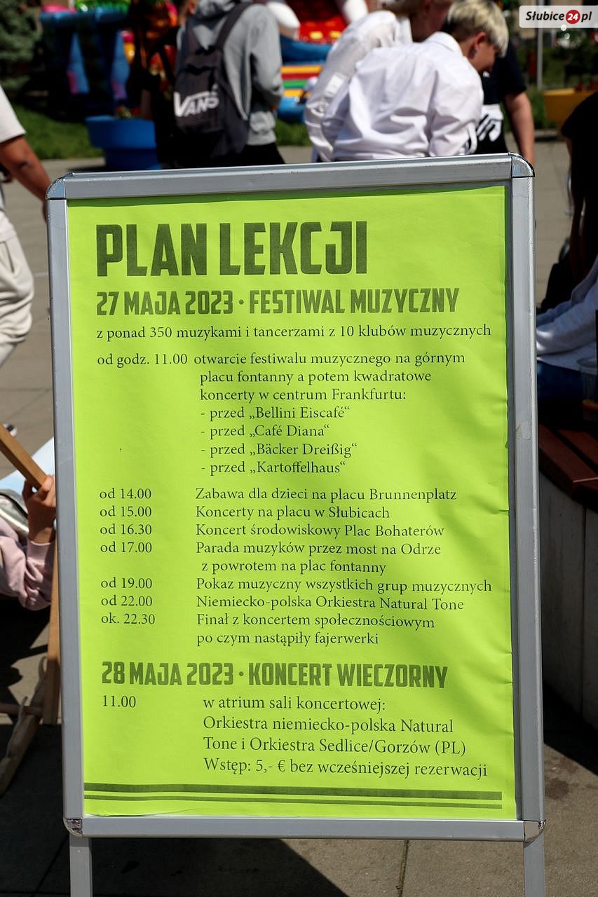 Główny koncert po polskiej stronie miał miejsce 27 maja na placu Bohaterów. Zgromadzonych gości i muzyków witali wspólnie burmistrz Słubic Mariusz Olejniczak oraz dyrektor muzyczny orkiestry Fanfarengarde Hans Joerg Laurisch, którzy jest jej szefem od 1977 roku. To właśnie w ramach tej orkiestry funkcjonują Fanfary Europy, czyli polsko-niemiecka orkiestra dęta składająca się z dzieci i młodzieży z obu miast.