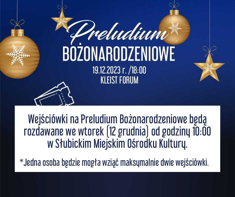 Słubicki Miejski Ośrodek Kultury poinformował, że wejściówki na tegoroczne Preludium Bożonarodzeniowe będą rozdawane 12 grudnia od godz. 10.00 w siedzibie SMOK-a. Jedna osoba będzie mogła wziąć maksymalnie dwie wejściówki.