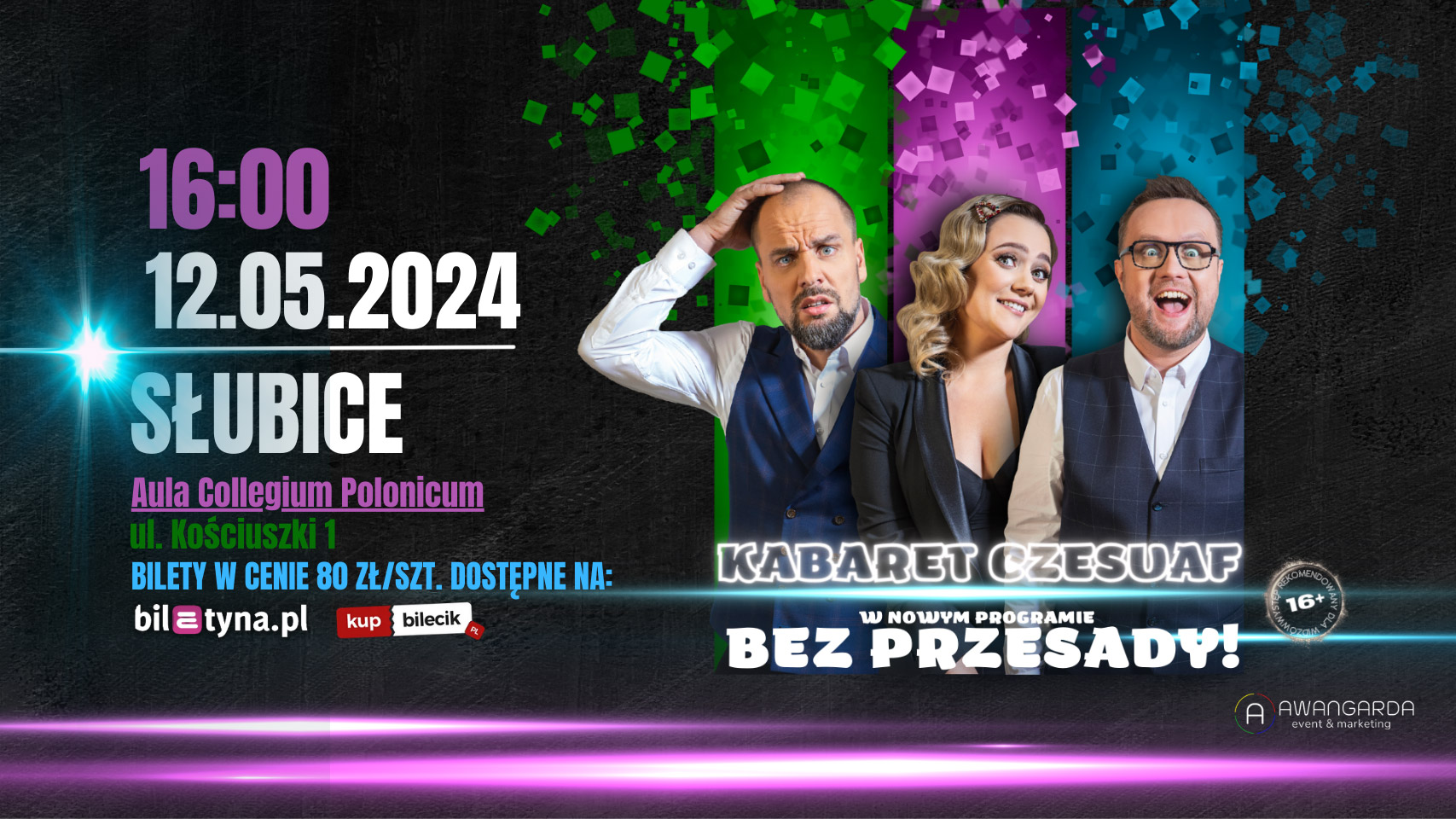 KABARET CZESUAF rusza w Polskę. Poprzedni program „Skandal!” obejrzały tysiące widzów, mamy nadzieję, że nowe skecze znajdą jeszcze większe rzesze odbiorców. Może nawet miliony? Bez przesady! Właśnie taki tytuł nosi nowy program Czesuafów. „Bez przesady!” to próba zmierzenia się z tym, co widzimy dookoła siebie. Dlaczego wszystko wyolbrzymiamy? Polscy piłkarze przegrają mecz – „klęska”, „tragedia”. Iga Świątek wygra – „miazga”, „pogrom”. A powiedzmy sobie szczerze, najczęściej w Polsce jest po prostu średnio. Za to na pewno średni nie jest nowy program kabaretu Czesuaf, bowiem Olga, Tomek i Maciek dają z siebie na scenie wszystko, a nawet jeszcze więcej. Recenzje widzów nie kłamią – program kabaretu Czesuaf to dwie godziny zabawy na najwyższym poziomie! To będzie naprawdę niezapomniany wieczór... Chyba że zagramy po południu, to wtedy niezapomniane popołudnie. I mówimy to bez przesady!