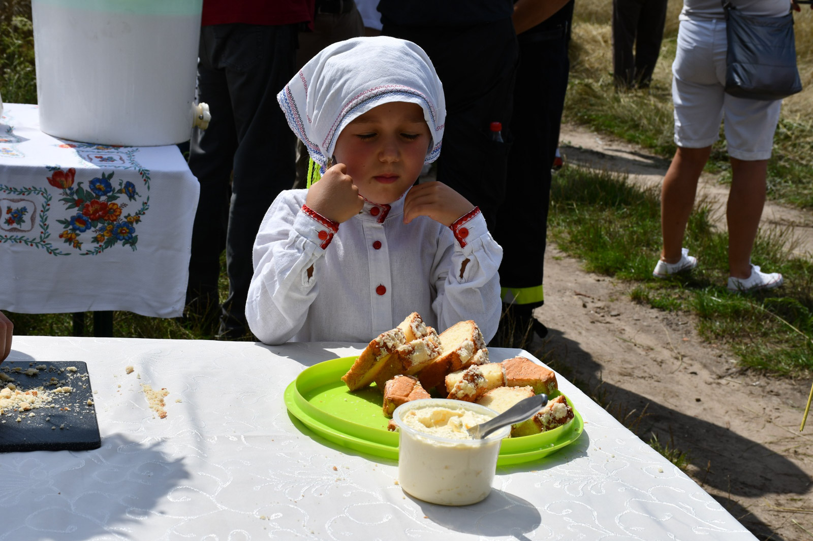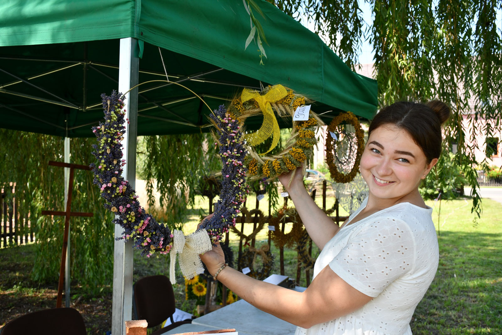 Po powrocie na plac przy dworku zaprezentowano kolejne etapy żniw, wypiek chleba i jego degustację. Część biesiadną uświetniły występy zespołów Żemerwa, Śpiewuny i Kryniczeńka. Nie zabrakło też innych atrakcji: były pokazy przygotowane przez strażaków, swojskie jedzenie, rękodzieło oraz stoiska z tradycyjnym rzemiosłem.