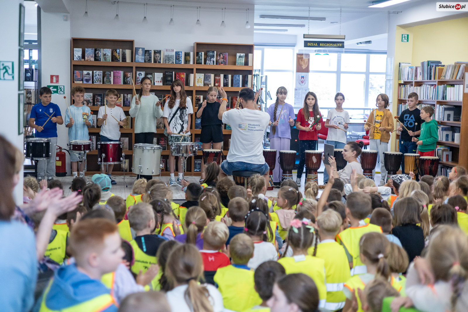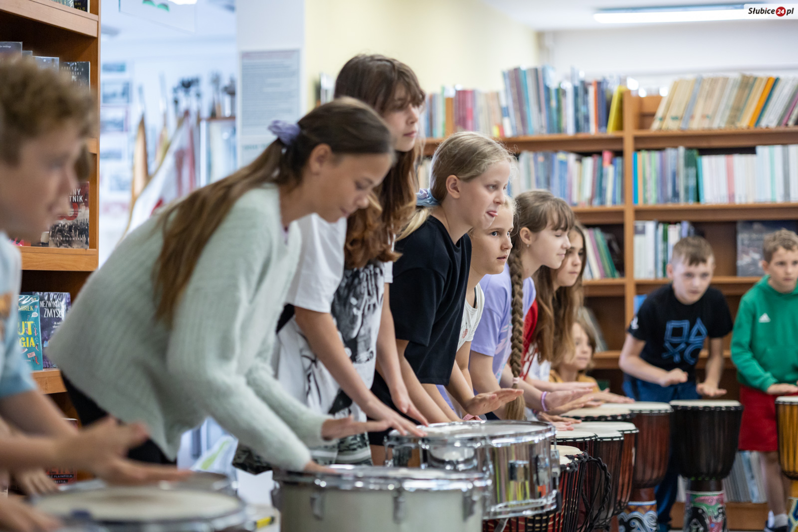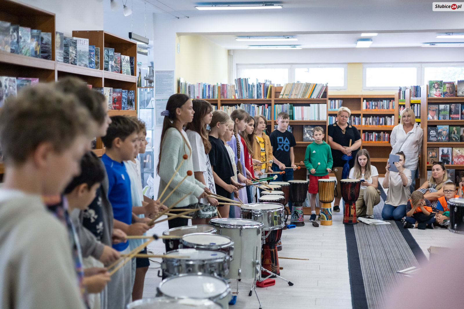 Choć kapryśna pogoda pokrzyżowała plany i przeniosła koncert z ogrodu do wnętrza biblioteki, nie odebrało to energii uczestnikom warsztatów perkusyjnych „Rytmiczne Spotkanie Kulturowe”. Młodzi muzycy zagrali dla mieszkańców Słubic, pokazując, czego nauczyli się podczas wspólnych ćwiczeń z Akademią Trzech Instrumentów.
