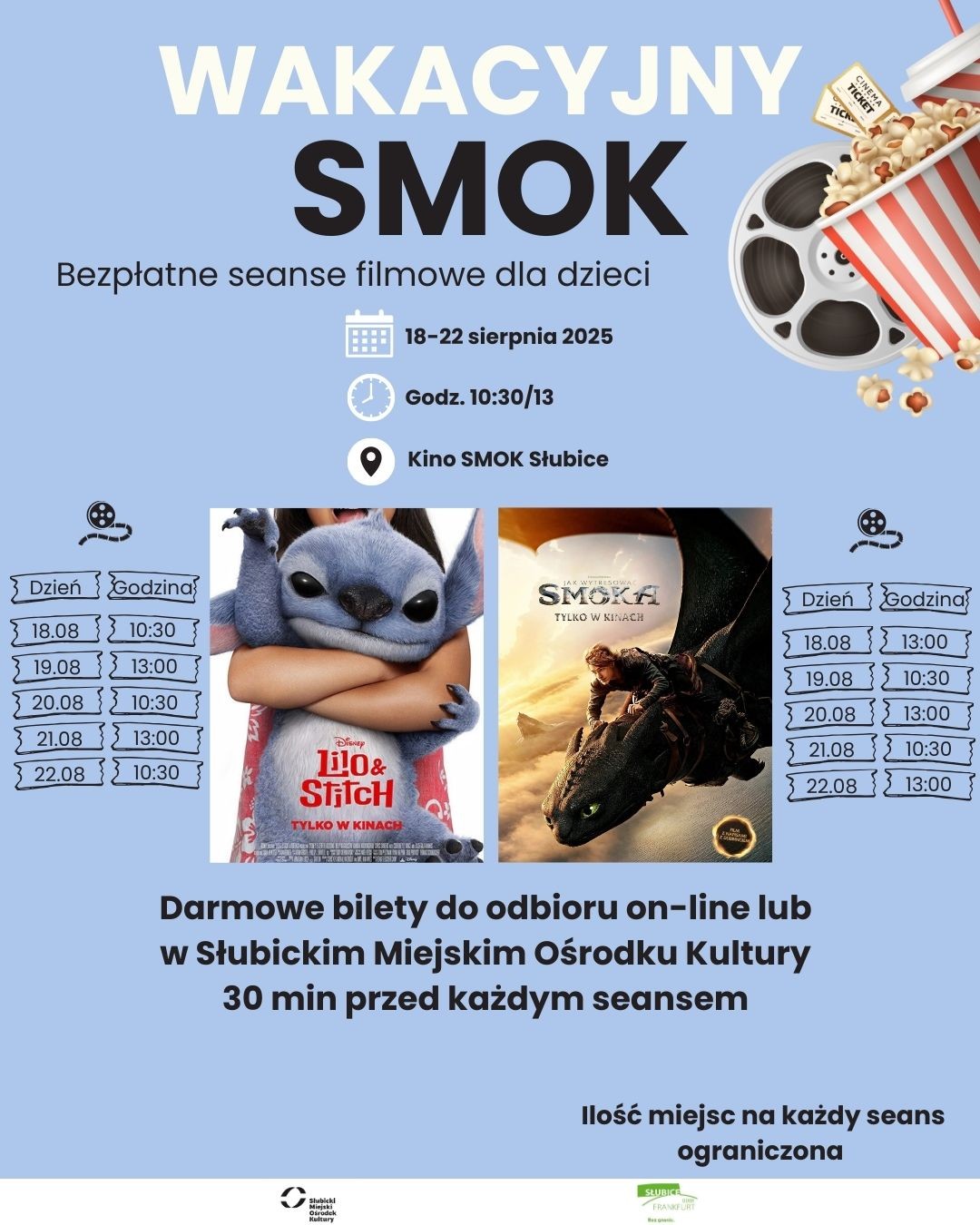 Słubicki Miejski Ośrodek Kultury zaprasza najmłodszych na specjalne, wakacyjne seanse filmowe. W dniach od 18 do 22 sierpnia w kinie SMOK odbędzie się cykl „Wakacyjny SMOK”, w ramach którego wyświetlane będą dwa popularne filmy animowane: „Lilo i Stitch” oraz „Jak wytresować smoka”.