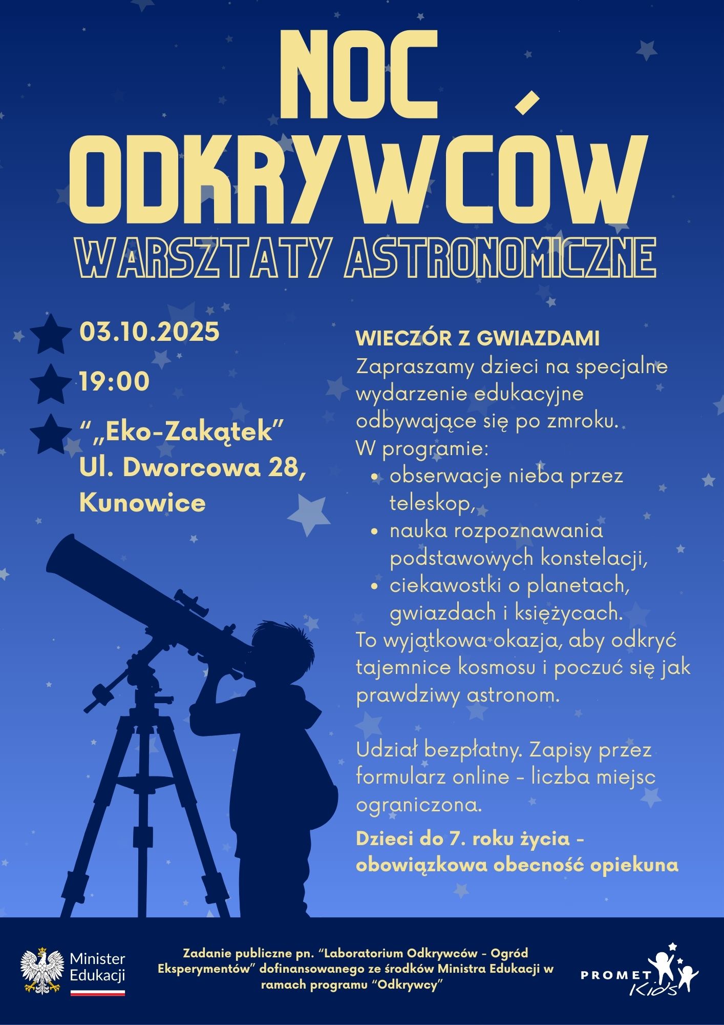 Pierwsze wydarzenie – „Noc Odkrywców” – będzie poświęcone astronomii i zaplanowano je 3 października o godz. 19:00 na terenie Eko-Zakątku przy ul. Dworcowej 28 w Kunowicach. Dzieci poznają podstawowe zagadnienia dotyczące wszechświata i Układu Słonecznego, a zajęcia zostaną przygotowane tak, aby były jednocześnie zrozumiałe i fascynujące.