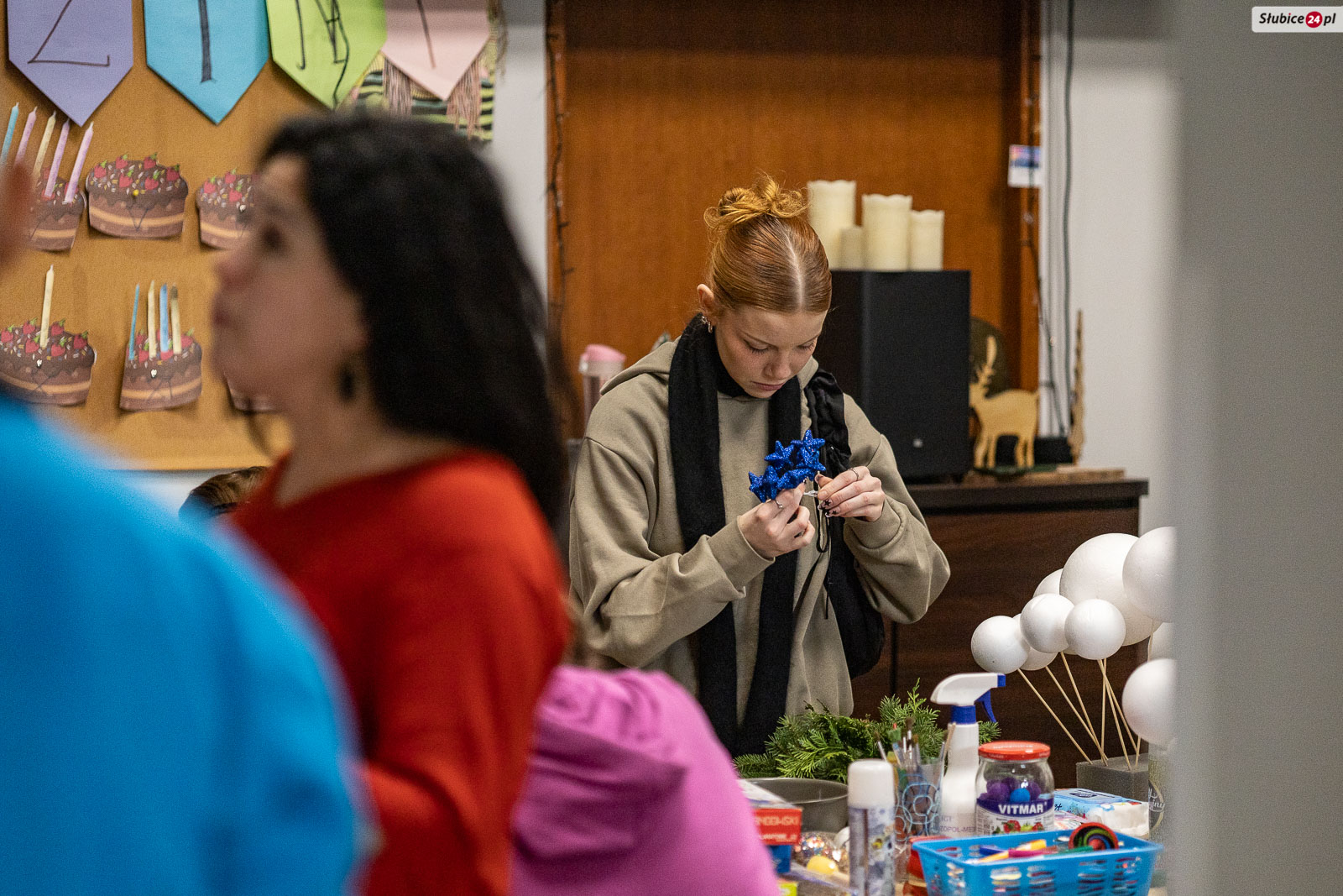 Uczestnicy warsztatów tworzyli własne świąteczne ozdoby. Na stołach czekały styropianowe bombki, wieńce, cekiny, pomponiki, farby, kartki, brokat i mnóstwo innych materiałów, które rozbudzały wyobraźnię. Nie zabrakło również słodkiego akcentu – dla wszystkich przygotowano gorące kakao.