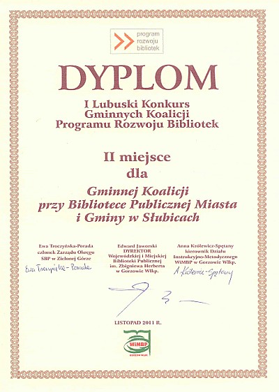 - Celem konkursu była promocja przedsięwzięć kulturalno-społecznych zrealizowanych przez gminne koalicje powstałe w trakcie realizacji Programu Rozwoju Bibliotek. Ważnym aspektem była także integracja lokalnego środowiska oraz inspirowanie bibliotekarzy i przedstawicieli lokalnej społeczności do twórczej współpracy i realizacji wspólnych działań - poinformowali przedstawiciele słubickiej biblioteki.