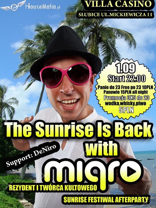 - Impreza pod hasłem THE SUNRISE IS BACK na pewno na długo pozostanie w Waszych głowach i sercach, znakomity gość specjalny DJ MIQRO ojciec chrzestny AFTERPARTY po SUNRISE FESTIVAL na plaży w Kołobrzegu, przeniesie Was w świat housowych doznań. To będzie najgorętsza impreza roku - zapewniają właściciele lokalu.