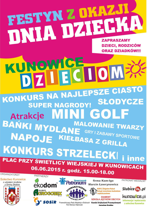 6 czerwca w Kunowicach zapraszamy na festyn z okazji Dnia Dziecka organizowany pod hasłem "Kunowice dzieciom". Na wszystkich chętnych czeka sporo atrakcji m.in. gry i zabawy sportowe, konkursy, słodycze, grill, minigolf. Portal Słubice24 jest patronem medialnym imprezy. Ciekawostką będzie konkurs na najlepsze wypiek! Każda kunowicka gospodyni będzie mogła wykazać się kulinarnymi zdolnościami. Sołtys ufundował nagrody - za I miejsce jest zestaw obiadowy (talerze i filiżanki), II miejsce to naczynie żaroodporne, a za III pucharki na lody.