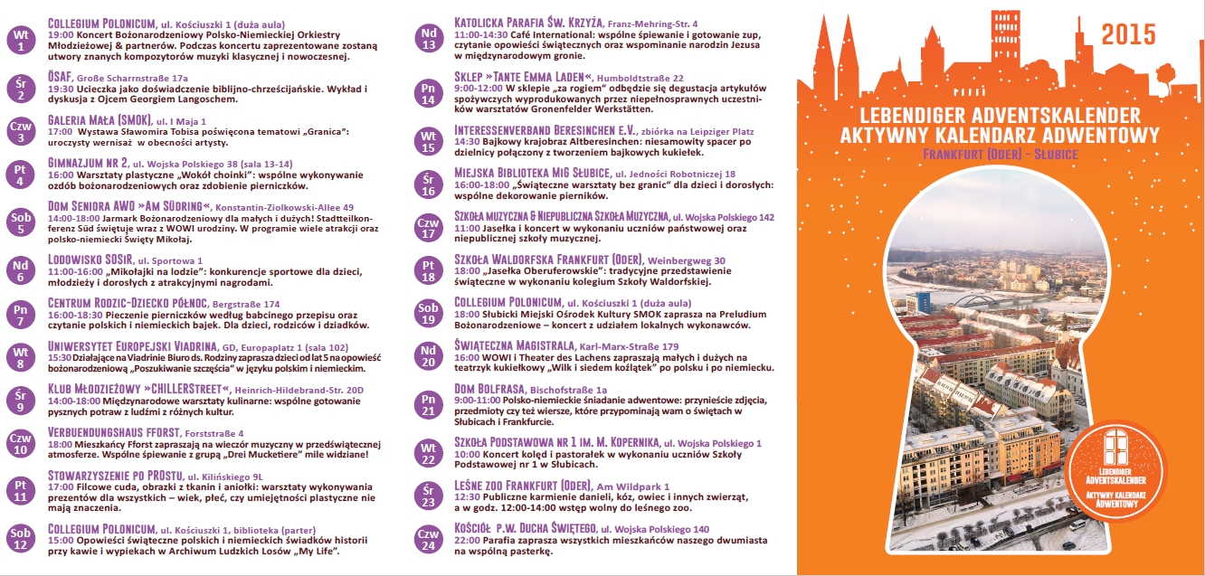 21 grudnia w godzinach 9.00-11.00 spółka Arle GmbH zaprasza na polsko-niemieckie śniadanie adwentowe w Domu Bolfrasa przy ulicy Bischofstraße 1a we Frankfurcie nad Odrą. W przyjemnej atmosferze można będzie nie tylko dobrze zjeść, ale też posłuchać ciekawych opowieści: goście mogą przynieść zdjęcia, rozmaite drobiazgi albo wiersze, które wiążą się ze świętami Bożego Narodzenia.
