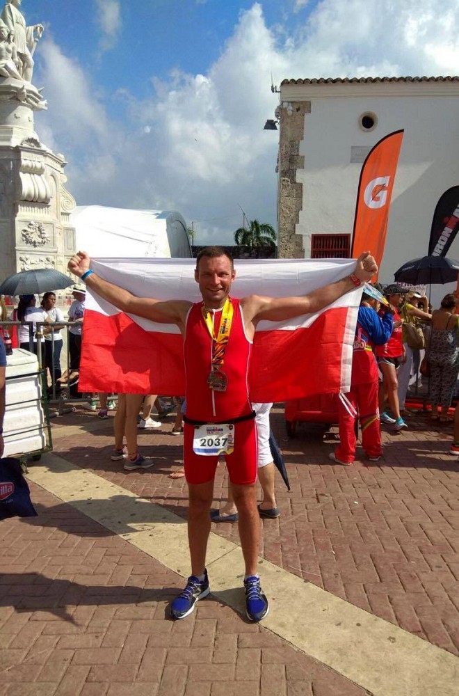 Ostatni start w tym roku przypadł 3 grudnia na Ironman 70.3 Cartagena w Kolumbii. Decyzja zapadła krótkoterminowo i miał być to sprawdzian dla organizmu w ciężkich warunkach. Pływanie odbyło się w Morzu Karaibskim. Organizator zaplanował start pierwszej fali (zawodnicy Pro) na 6:15. Moja grupa wiekowa miała startować o 7:21 (17 fala z 20). Doszło do 30 min. opóźnienia, tak więc temperatura powietrza miała już 32 stopnie. Z tego względu organizator poskracał odstępy czasowe pomiędzy startami poszczególnych fal zawodników. I dlatego przez cały dystans doganialiśmy wcześniejsze fale. Temperatura wody miała 29.2 stopnia, tak więc pływałem bez pianki i ostatecznie kończę ten etap z czasem 36 min. Wyjście z wody, długi dobieg do strefy zmian i zacząłem walkę na rowerze.