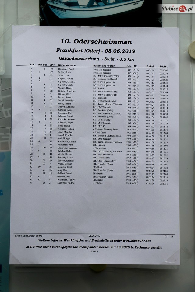 W gronie pływaków mieliśmy zawodników z Polski i Niemiec, praktycznie z całego pograniczna. Nie zabrakło także reprezntantów Słubic. Wśród nich najlepiej spisał się Bartosz Borula, który uplasował się na 10 miejscu z rezultatem 39:09.