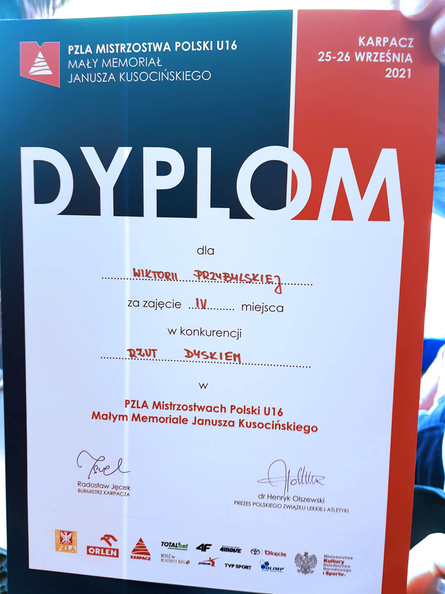 W tej samej konkurencji startowała także Julia Horoszkiewicz, która rzuciła 27,38 (20 miejsce), a wśród chłopców Seweryn Stań, który posłał dysk na odległość 40,32, co dało mu 13 lokatę. Opiekunem naszych miotaczy jest trener Łukasz Horoszkiewicz