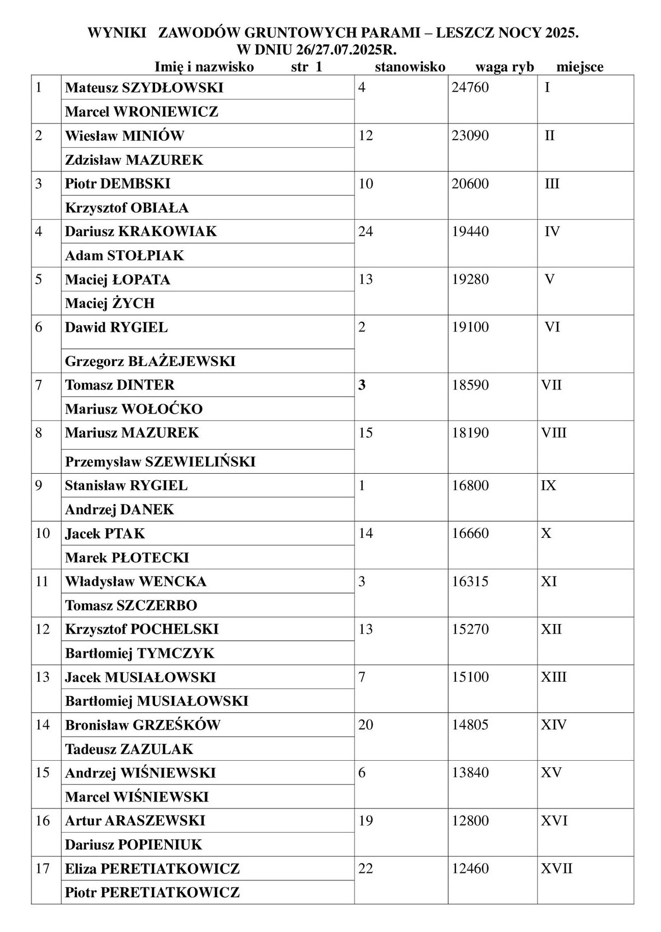 Wyniki końcowe zawodów „Leszcz Nocy 2025” znajdują się w poniższej tabeli.