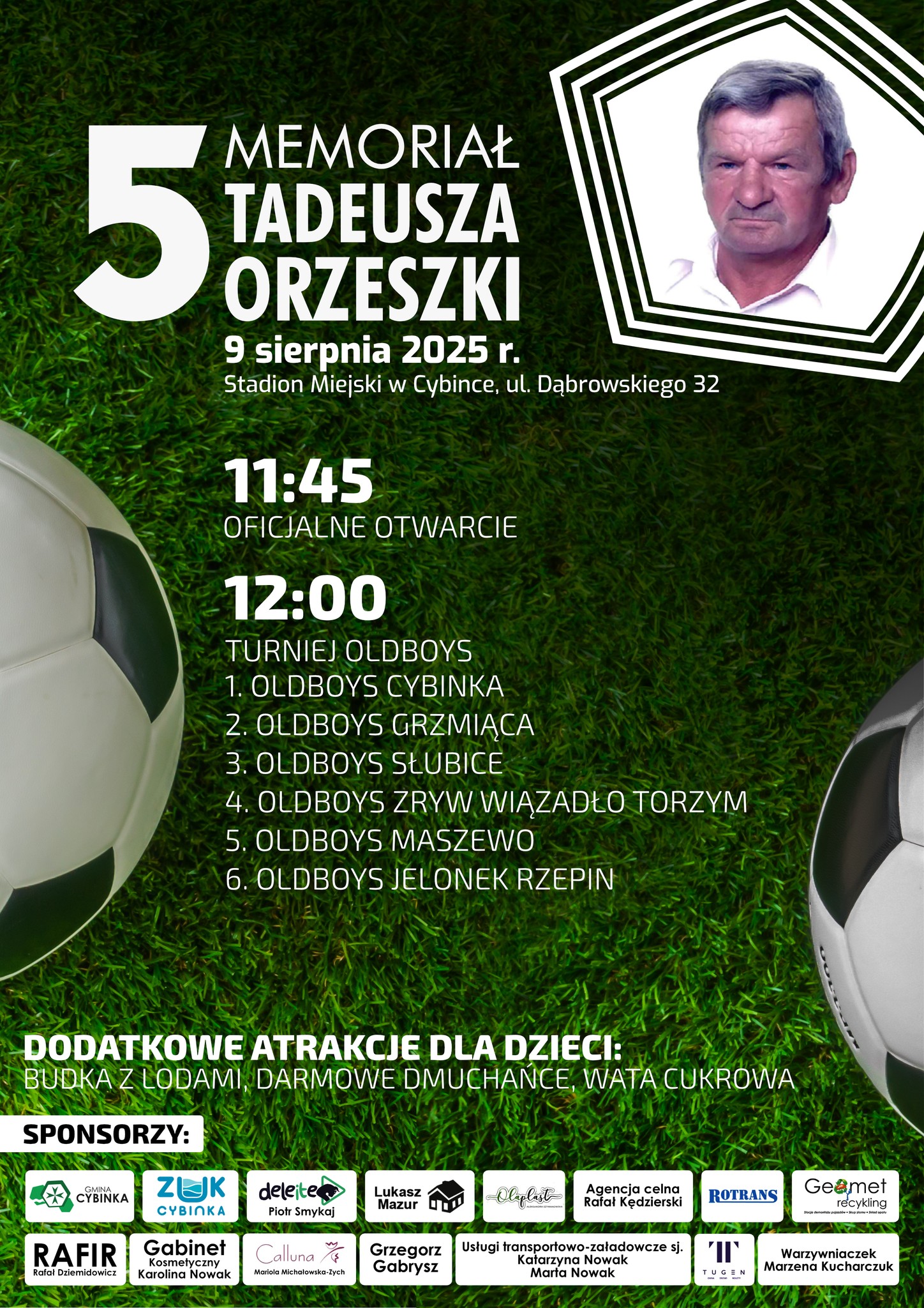 9 sierpnia zaplanowano 5. edycję Memoriału Tadeusza Orzeszko. Na stadionie miejskim w Cybince spotkają się drużyny oldbojów, by uczcić pamięć lokalnego społecznika i trenera.