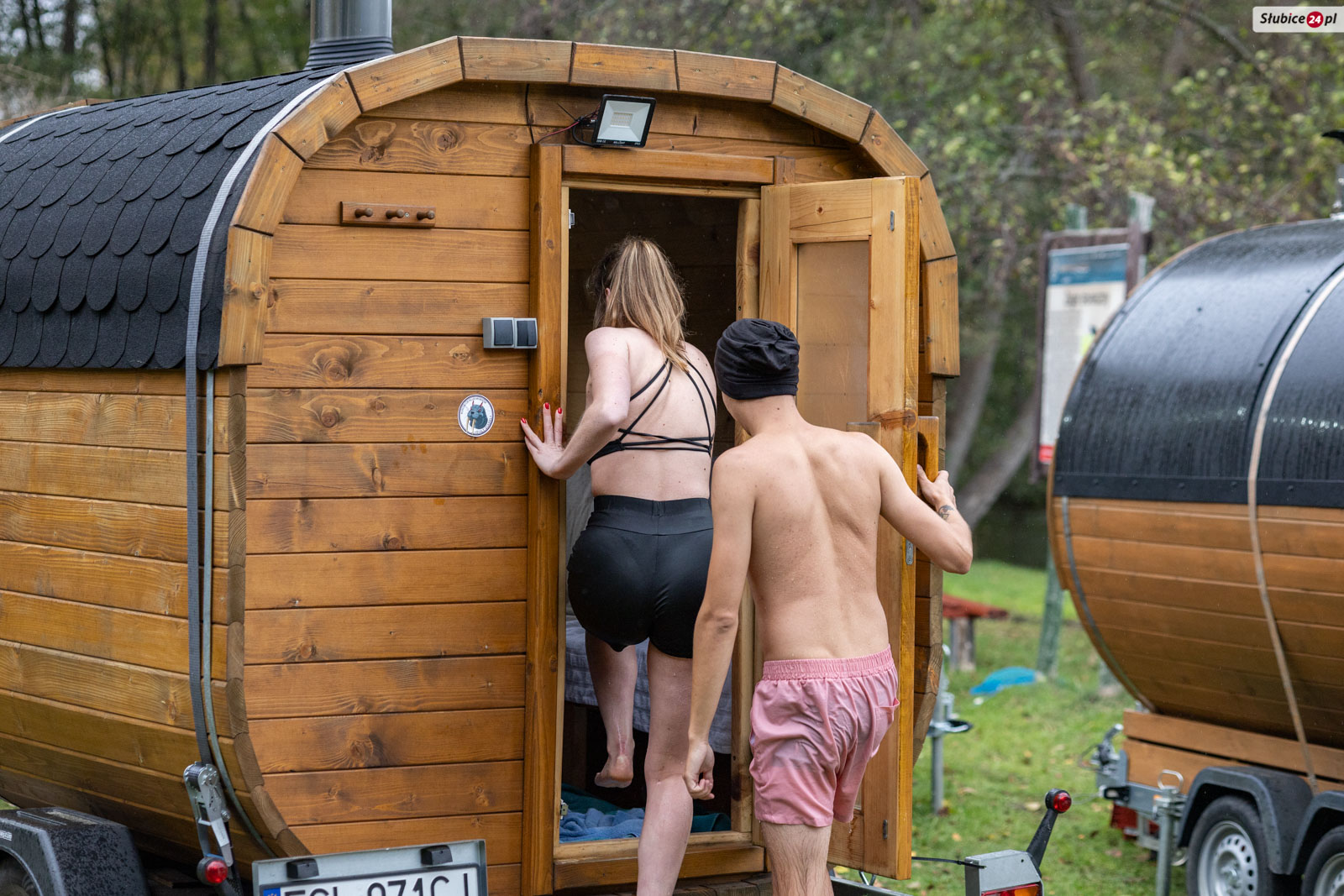 Na chętnych po wyjściu z jeziora czekała jeszcze sauna i jacuzzi – w sam raz na szybkie rozgrzanie i chwilę relaksu. Były też race dymne, konfetti, ognisko z kiełbaskami i inne smakołyki przygotowane przez członków klubu. Pojawił się też tort z okazji otwarcia sezonu.