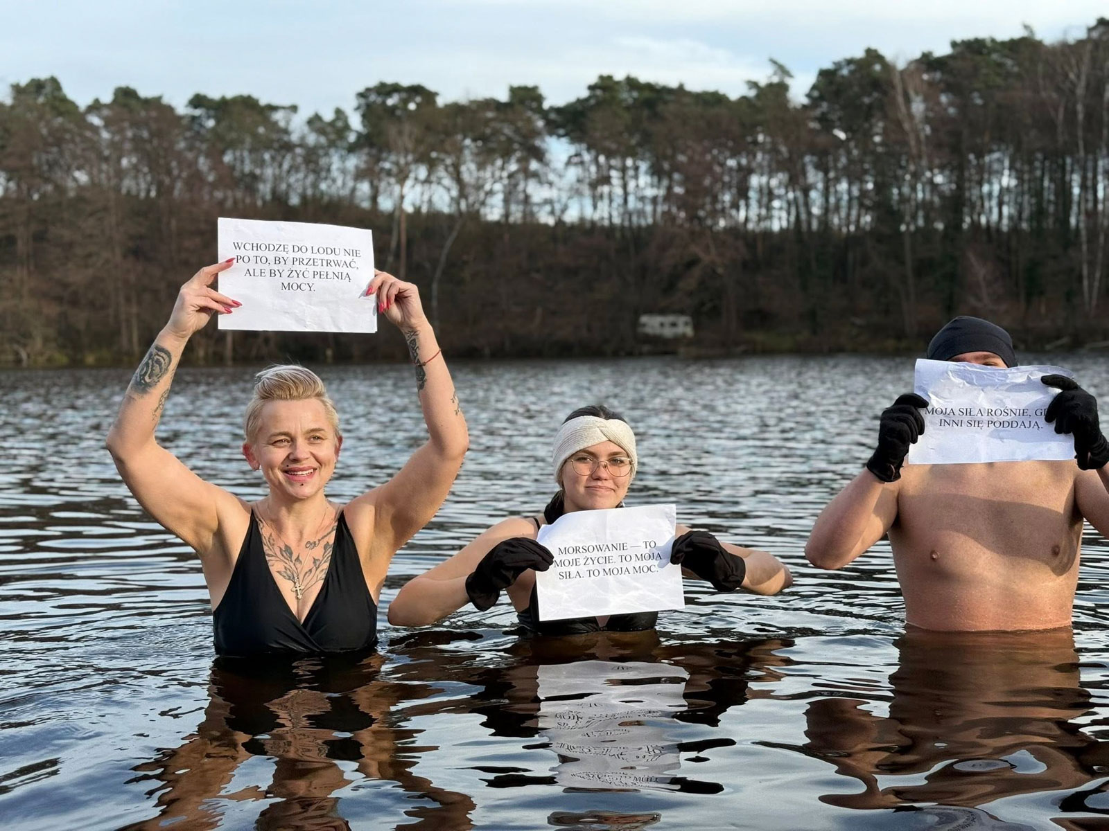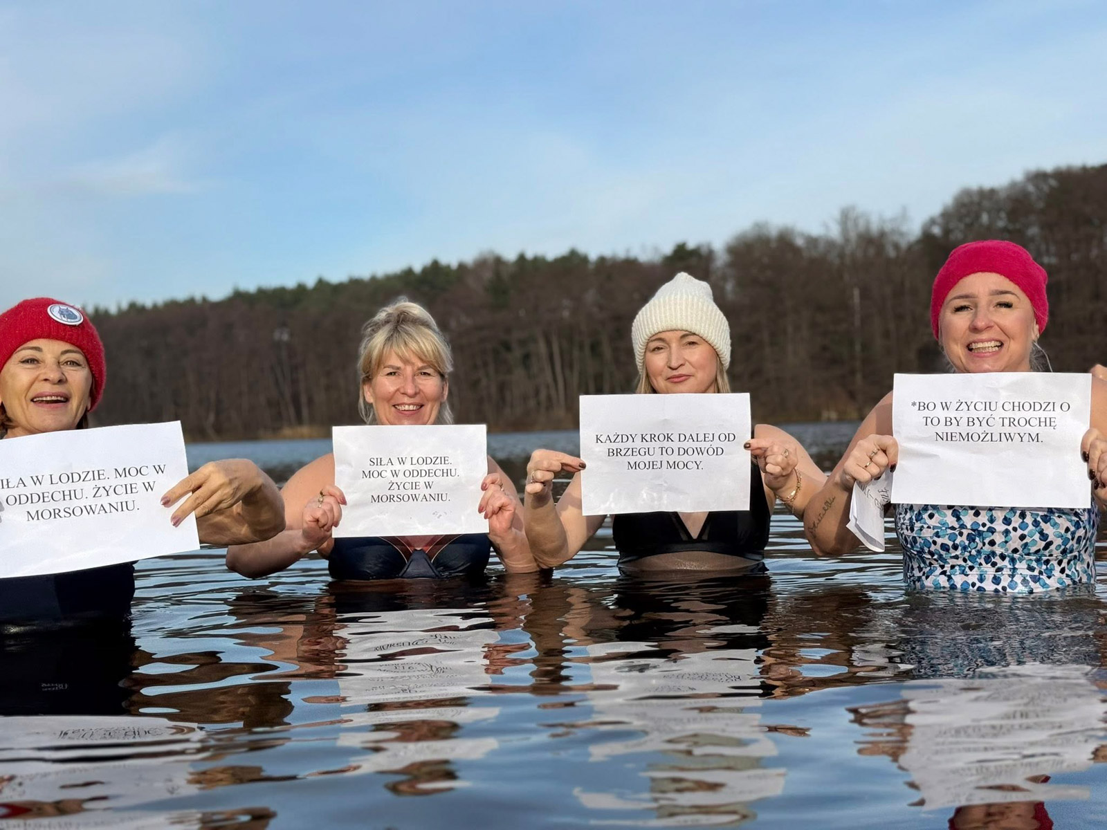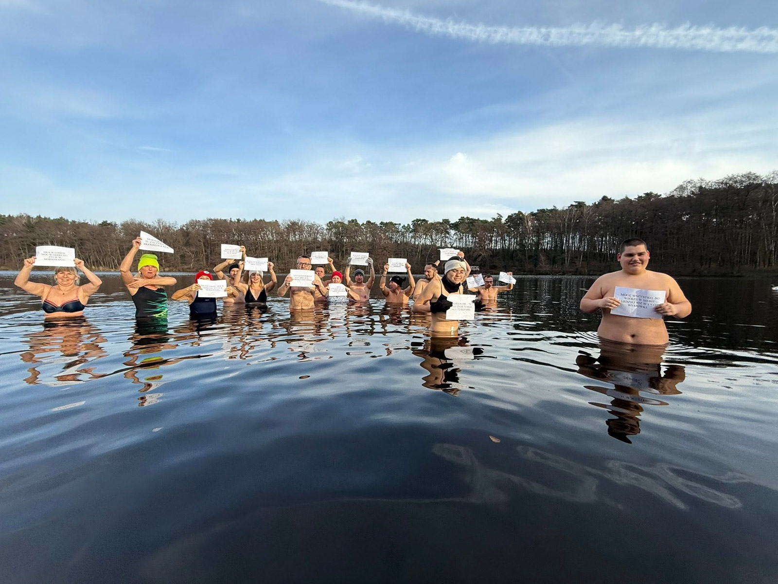 Niedzielne spotkanie Kunowickiego Klubu Morsów „Biały Diabeł” miało nietypowy charakter. 30 listopada uczestnicy morsowania przynieśli ze sobą hasła, które – z humorem lub na poważnie – wyjaśniały, dlaczego wchodzą do lodowatej wody.