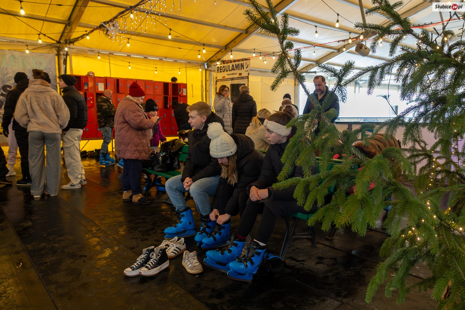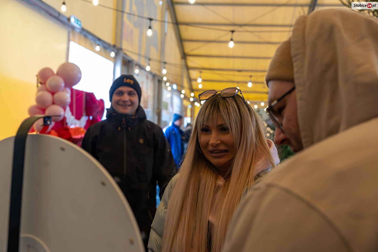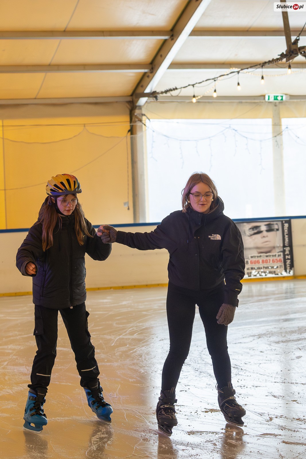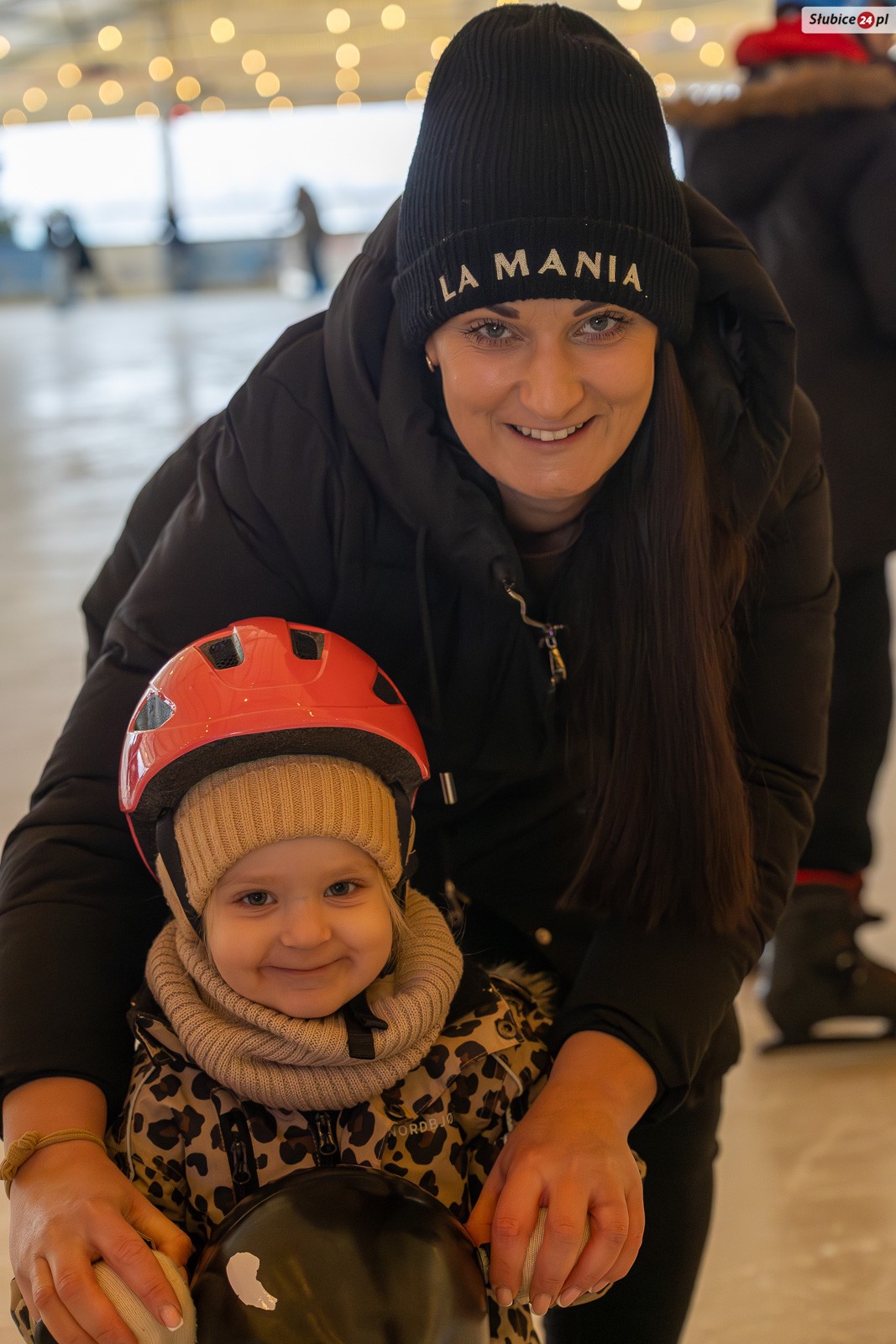 Tuż przy tafli lodowiska ustawiono też walentynkową ściankę zdjęciową z czerwonym tłem i balonami w kształcie serc. Można było z niej korzystać i zrobić sobie pamiątkowe zdjęcie z Mają, a później pojeździć z nią na łyżwach.