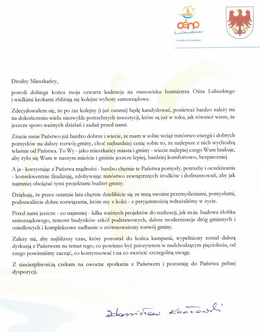 Burmistrz Ośna Lubuskiego Stanisław Kozłowski potwierdził, że będzie startował w nadchodzących wyborach samorządowych. Do mieszkańców skierował otwarty list, w którym zaprasza ich na spotkania i do rozmowy na ważne dla gminy tematy.